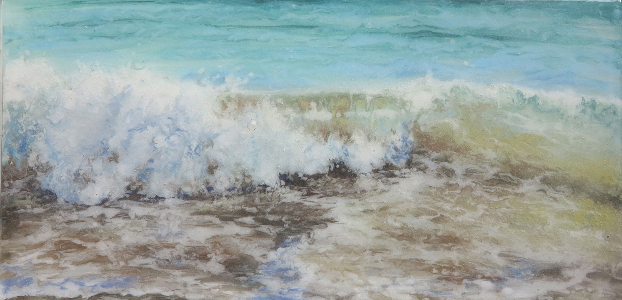 Original fused glass painting by Jane Reeves. Size: 37 x 24cm (including white painted frame). Image area: 26 x 13cm.